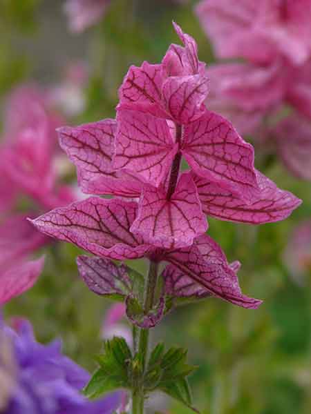 This very colourful little annual or biennial is planted in a single row in a very narrow circular border. This striking display combines three cultivars: Salvia viridis 'Blue Monday', 'Pink Sunday' and 'White Swan'. These cultivars are mixed together as seed and sold as Salvia viridis 'Tricolour Mix', although sometimes an alternative species name, Salvia horminum, is used.